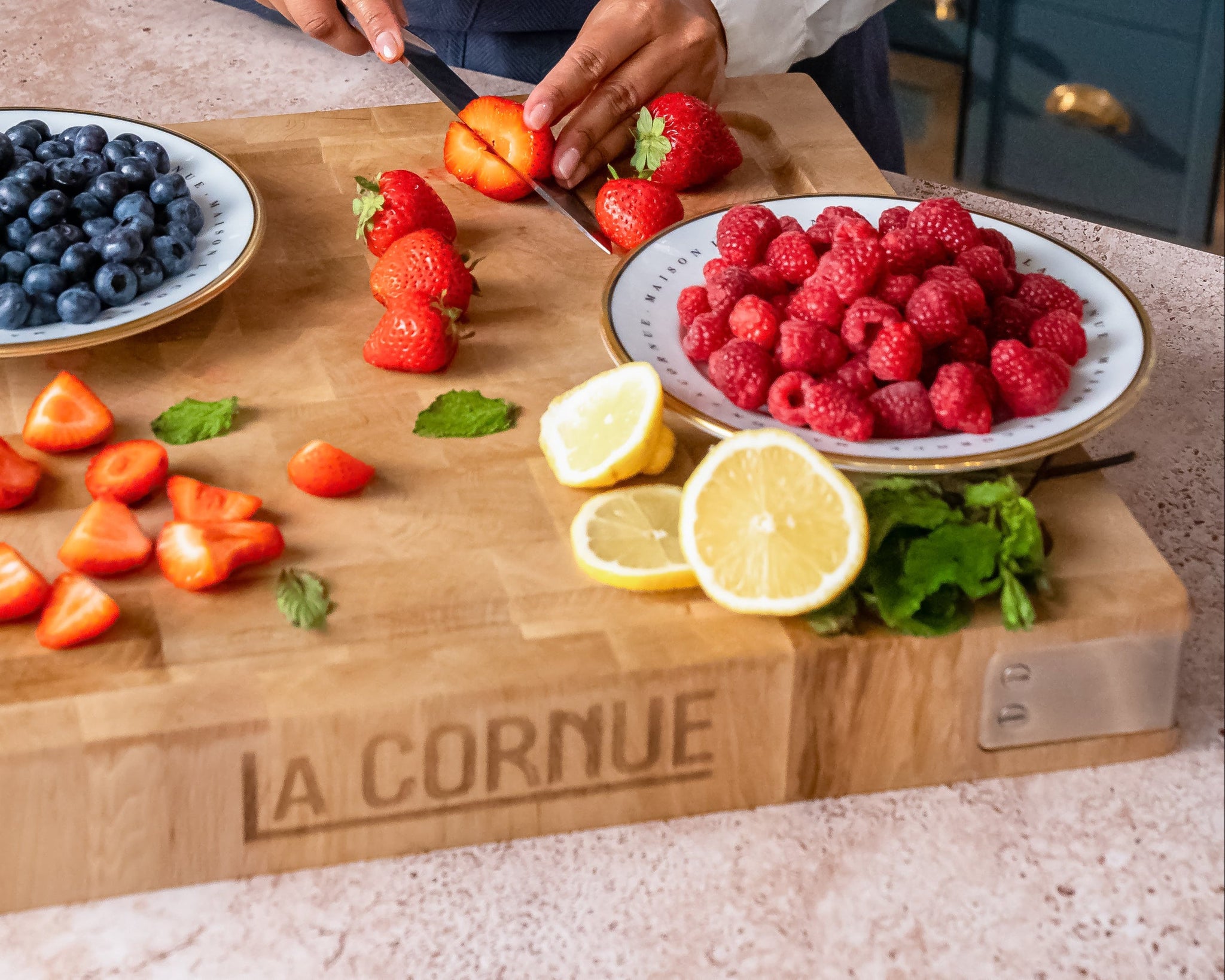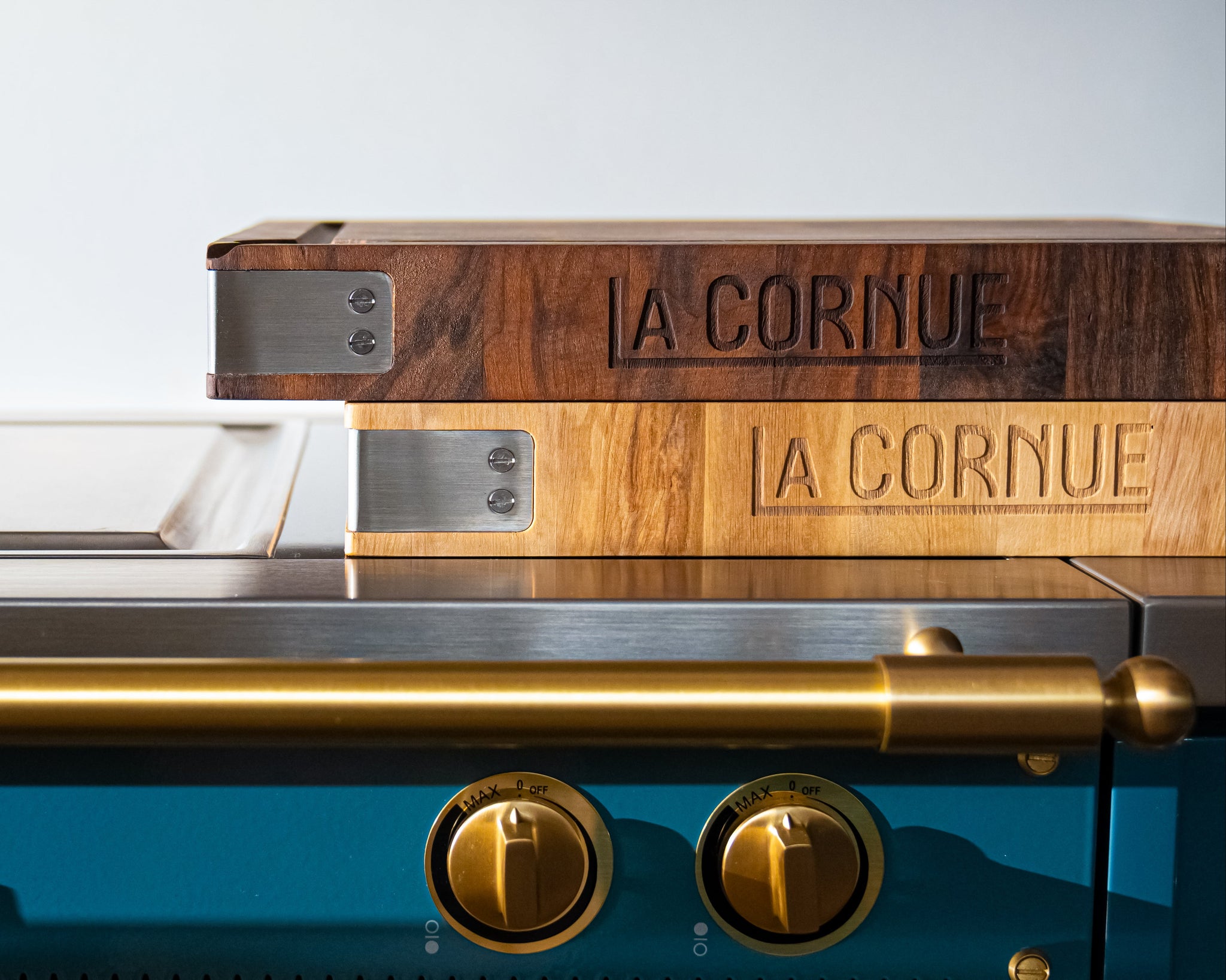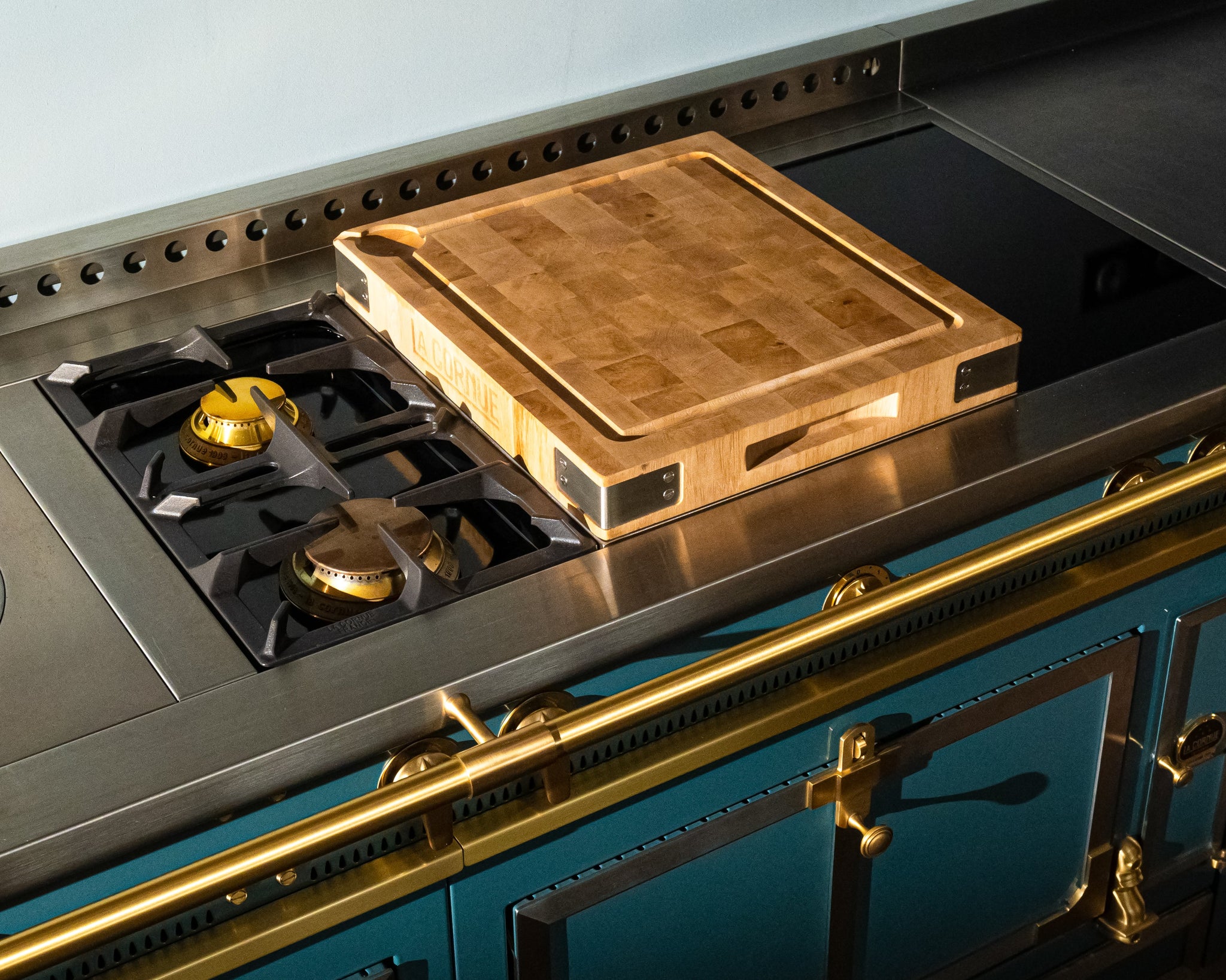 In line with the two hundred-year-old tradition of end-grain woodwork, crafted by artisans who have continued to prove its durability over the years, these understated chopping blocks are resistant to blades and direct heat. The La Cornue logo is finely hot-stamped into the wood, a subtle and elegant signature that reflects the craftsmanship and heritage shared by both Houses.